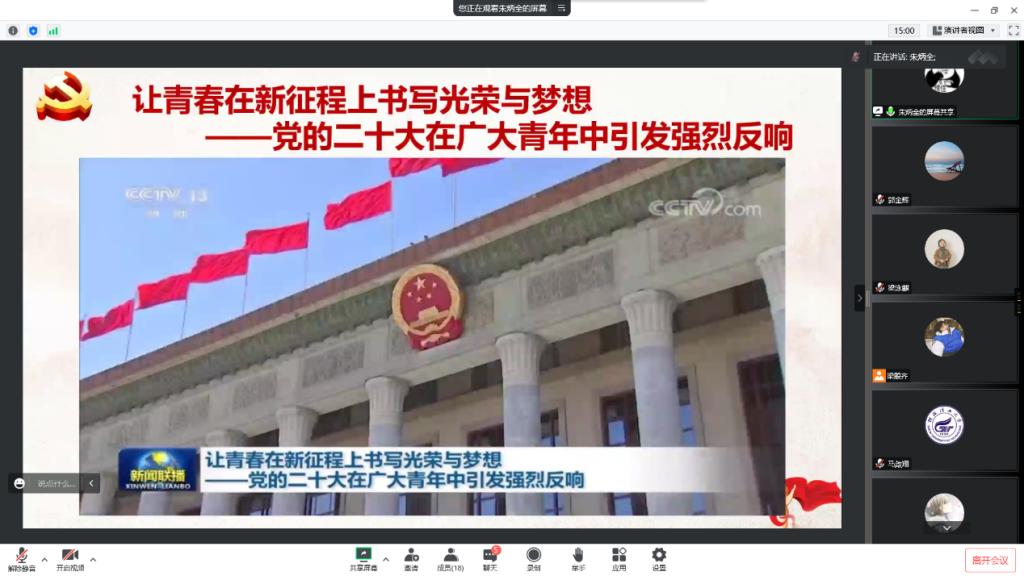 本科生第一党支部通过线上开展“高扬思想旗帜,凝聚复兴伟力”学习贯彻党的二十大精神主题党日活动,全体党员参加活动,会议由支部副书记梁殷齐同志主持。