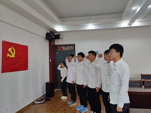 会议第四阶段,在党支部书记杨平平老师的带领下,本次接收的五名预备党员同志一起面向党旗进行庄严宣誓。在党旗面前,各位预备党员同志更加坚定了自己向党组织靠拢的决心,以及争取早日加入中国共产党的迫切希望。