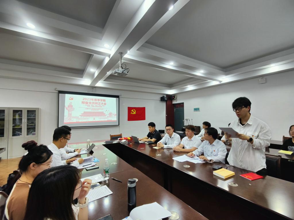 本科生第四党支部于雁山校区12407会议室召开了2023年春季学期预备党员转正大会。会议由党支部书记杨平平老师主持,支部全体党员同志参与本次会议。本次会议的议题是讨论关于候宏煜、张郅力、韦柏乐、柳业承、褟倩茹、毛华昀、代丽娜七名同志由预备党员转为正式党员的问题。