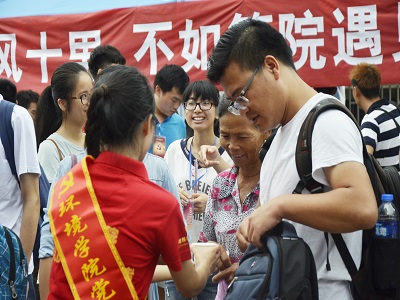 在迎新地点的党员志愿者们同样也尽职尽责,仔细的接待每一位新生和家长,并且有如一个标本,有如楷模,向大家示范怎么去做好迎新工作。大到注册报到,小到宿舍钥匙,他们都耐心讲解,热心服务,以饱满的热情、周到的服务让新生和家长感受到实实在在的温暖。