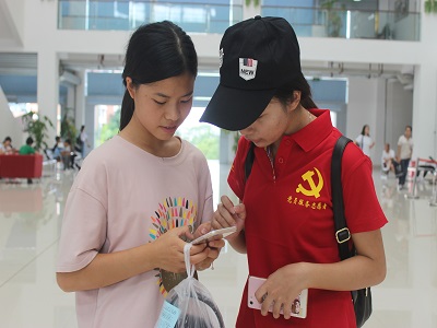 学生党员的迎新地点就在一个小角落,但是在整个校园里,无论是住宿区还是图书馆等,你都能发现党员志愿者们热情活力的身影。他们身穿统一制作的印有院标、党徽及寸止挑战