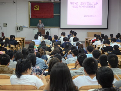 与旅游学院联合分党校2017年秋季学期入党积极分子培训班开班典礼在雁山校区06408教室举行。旅游学院党委书记李少游老师、旅游学院辅导员唐玉福老师、寸止挑战