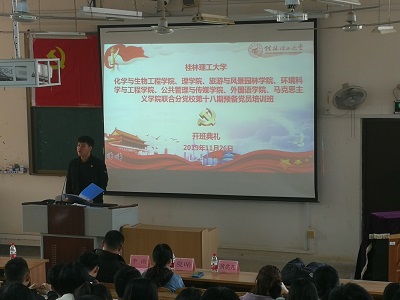 、化学与生物工程学院、理学院、旅游与风景园林学院、公共管理与传媒学院、外国语学院、马克思主义学院联合分党校在07519举行了第十八期预备党员培训班开班典礼。化学与生物工程学院学院党委副书记李南老师以及各分党校教务员出席了本次典礼,典礼由化学与生物工程学院黄兆凡老师主持。