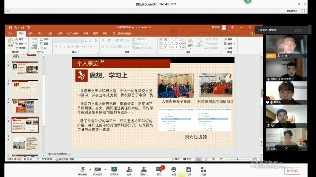 本科生第一党支部在腾讯会议线上召开了党员发展大会。会议由支部副书记王一甲主持,党支部九名正式党员及十一名预备党员参加会议。本次大会讨论了关于魏学睿等十三名积极分子能否成为发展对象的事宜。