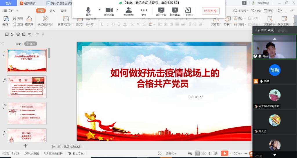 本科生四支部利用腾讯会议APP开展“如何做好抗击疫情战场上的合格共产党员”线上专题党课教育活动。支部书记杨平平同志主持会议,全体支部党员和发展对象参加会议。