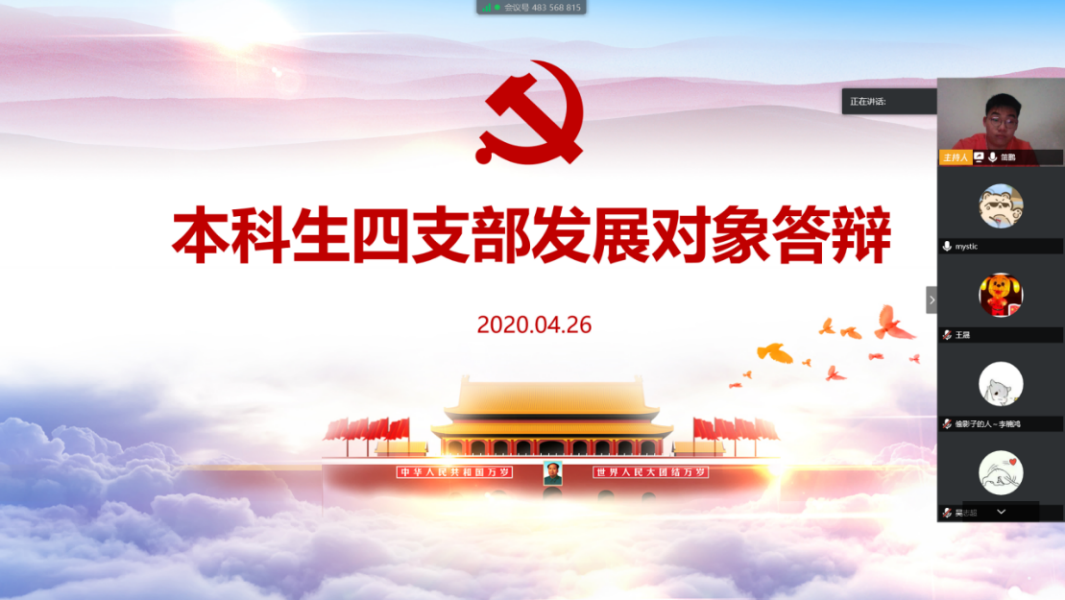 本科生第四党支部召开2020年春季学期发展对象答辩会。因为新冠疫情影响,本次答辩工作使用腾讯会议在线上进行。大会由支部副书记简鹏同志主持,支部全体成员参加。