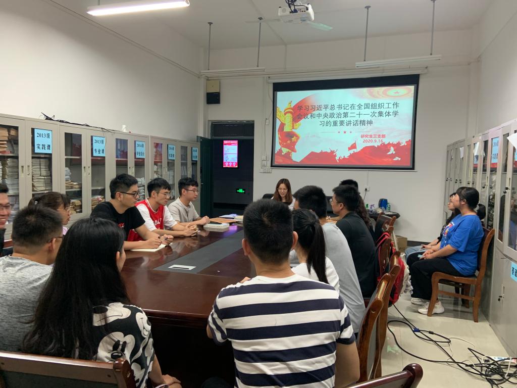 研三党支部书记冷贝贝老师组织党支部学生在雁山校区12414会议室集中观看习近平总书记在全国组织工作会议和中央政治第二十一次集体学习的讲话视频,学习讲话精神。