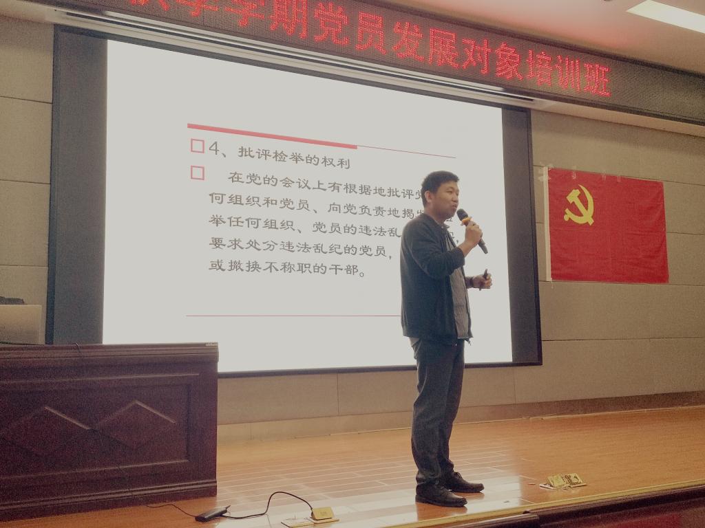 11月4日中午,在01501会议室,机械与控制工程学院党委副书记王迎波为联合分党校2020年秋季学期党员发展对象培训班,做《共产党员的权利和义务》专题党课。